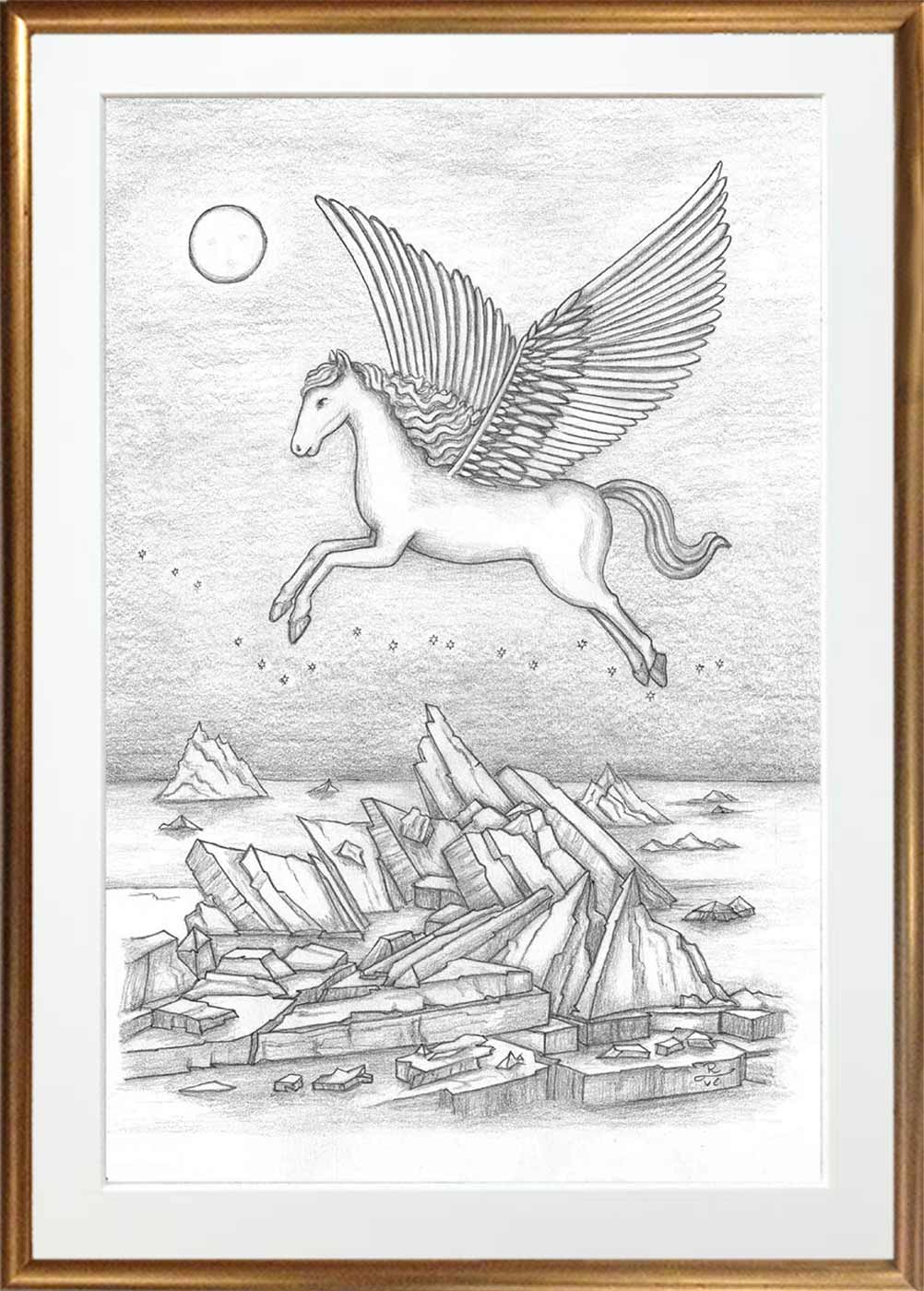 Motiv aus einem Bilder-Zyklus zu 10 Caspar-David-Friedrich-Gemälden. Jede dieser Zeichnungen der Meta-Romantik trägt etwas ‚Übergeordnetes‘ in sich, eine neue Perspektive, etwas Außergewöhnliches, das die ursprüngliche Szenerie bei Caspar David Friedrich sprengt.
