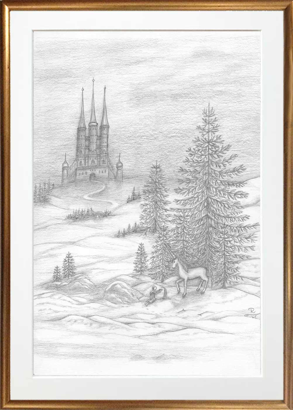 Motiv aus einem Bilder-Zyklus zu 10 Caspar-David-Friedrich-Gemälden. Jede dieser Zeichnungen der Meta-Romantik trägt etwas ‚Übergeordnetes‘ in sich, eine neue Perspektive, etwas Außergewöhnliches, das die ursprüngliche Szenerie bei Caspar David Friedrich sprengt.