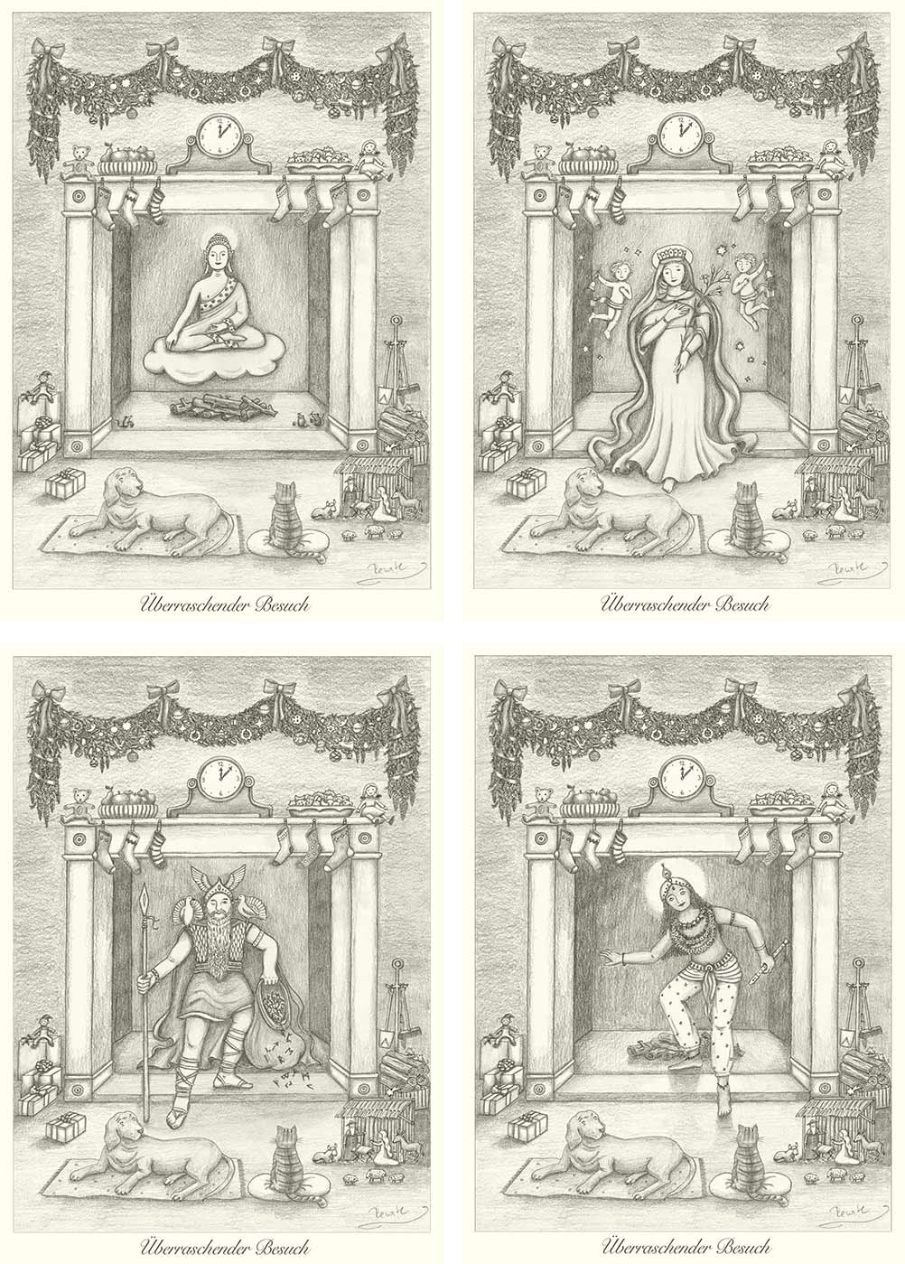 Postkartenset bestehend aus vier verschiedenen Motiven ‚Überraschender Besuch‘