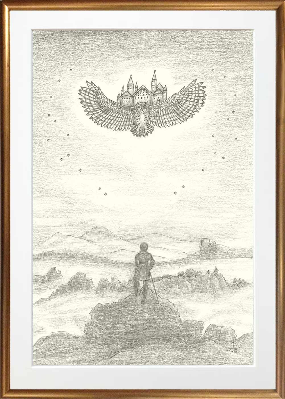 Motiv aus einem Bilder-Zyklus zu 10 Caspar-David-Friedrich-Gemälden. Jede dieser Zeichnungen der Meta-Romantik trägt etwas ‚Übergeordnetes‘ in sich, eine neue Perspektive, etwas Außergewöhnliches, das die ursprüngliche Szenerie bei Caspar David Friedrich sprengt.